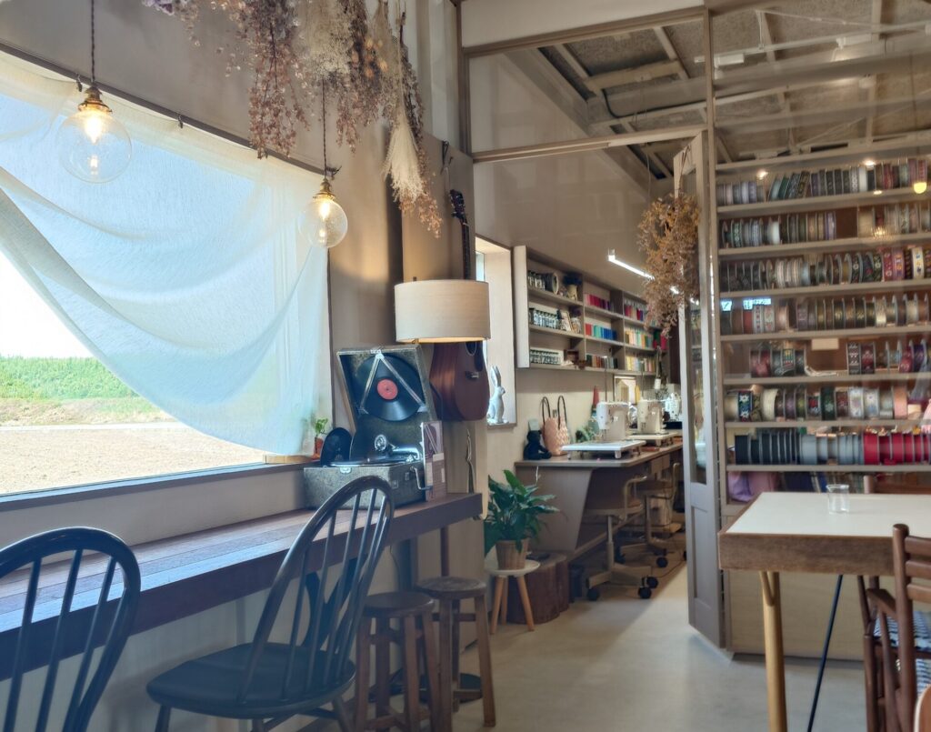 店内には、リボンショップのスペースと、ワークショップやカフェとして利用できる空間が広がっています。