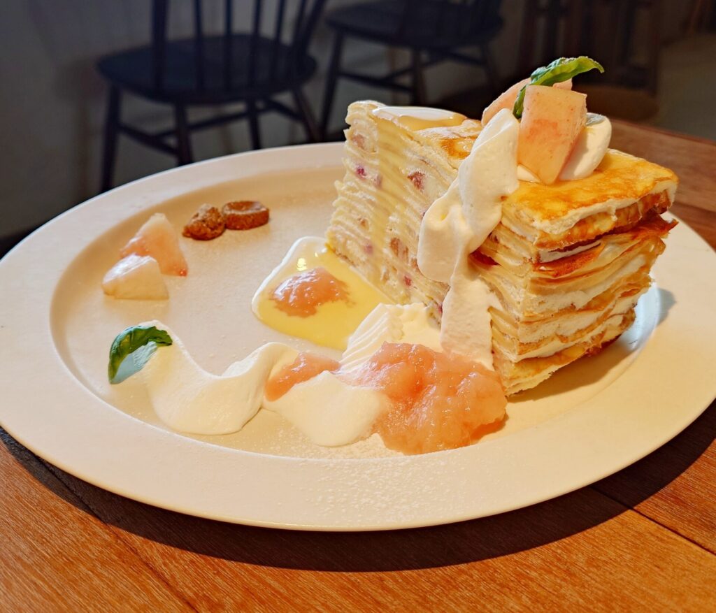 桃のミルクレープ!!なめらかなクリームが合わさっていて、桃も沢山はいっていて全体的にやさしい甘さに仕上がっていました。