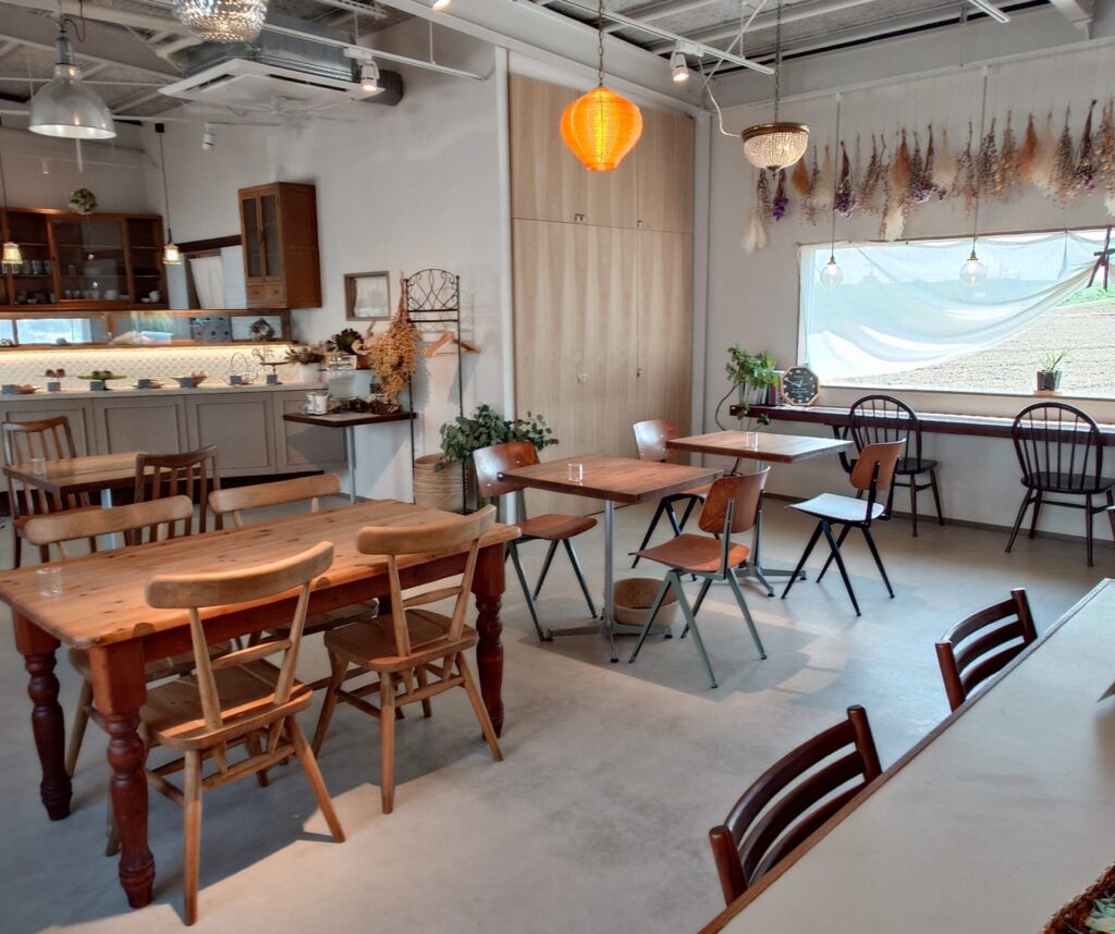 お店に到着してまず感じたのは、ほっとするような可愛らしさと落ち着きのある雰囲気。派手すぎないのに、どこかセンスの良さを感じる店内。やわらかな光に包まれたナチュラルな空間が広がっていて、時間がゆっくり流れているような感覚に。女性同士のお客さんやカップル、子供連れの家族もいらして、ワークショップしたりお茶をたのしんだりしていて居心地の良さがとても印象的でした。