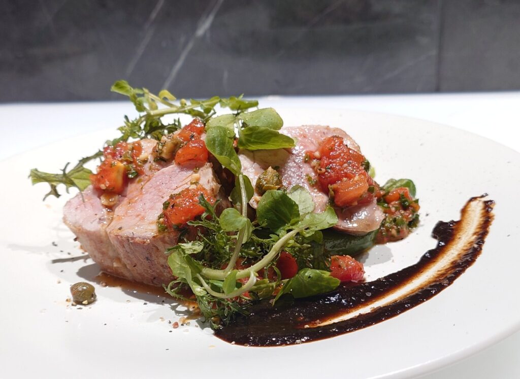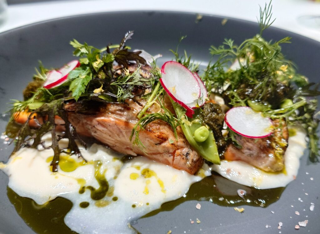 サーモンは、ナイフを入れた瞬間わかるふわっと感。口に入れるとしっとりやわらかく、火入れが本当に絶妙。